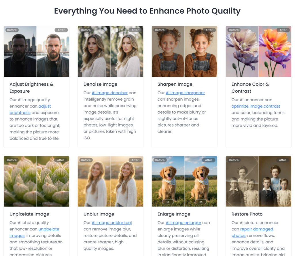Each of these tools is fully automated. For example, the AI Denoiser “intelligently removes grain and noise while preserving image details”, and the AI Sharpener enhances edges for clarity. All these tasks happen in one interface, so you can fix almost any quality issue with a few clicks. Users report that most enhancements complete in under 20 seconds, highlighting how fast Fotor works.