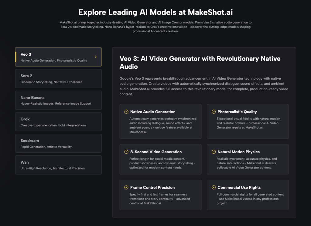 That’s exactly where MakeShot positions itself. MakeShot isn’t just another AI tool. It’s a unified AI studio that brings Veo 3, Sora 2, and Nano Banana Pro together in one platform, designed for people who need professional-grade output without managing five different subscriptions.