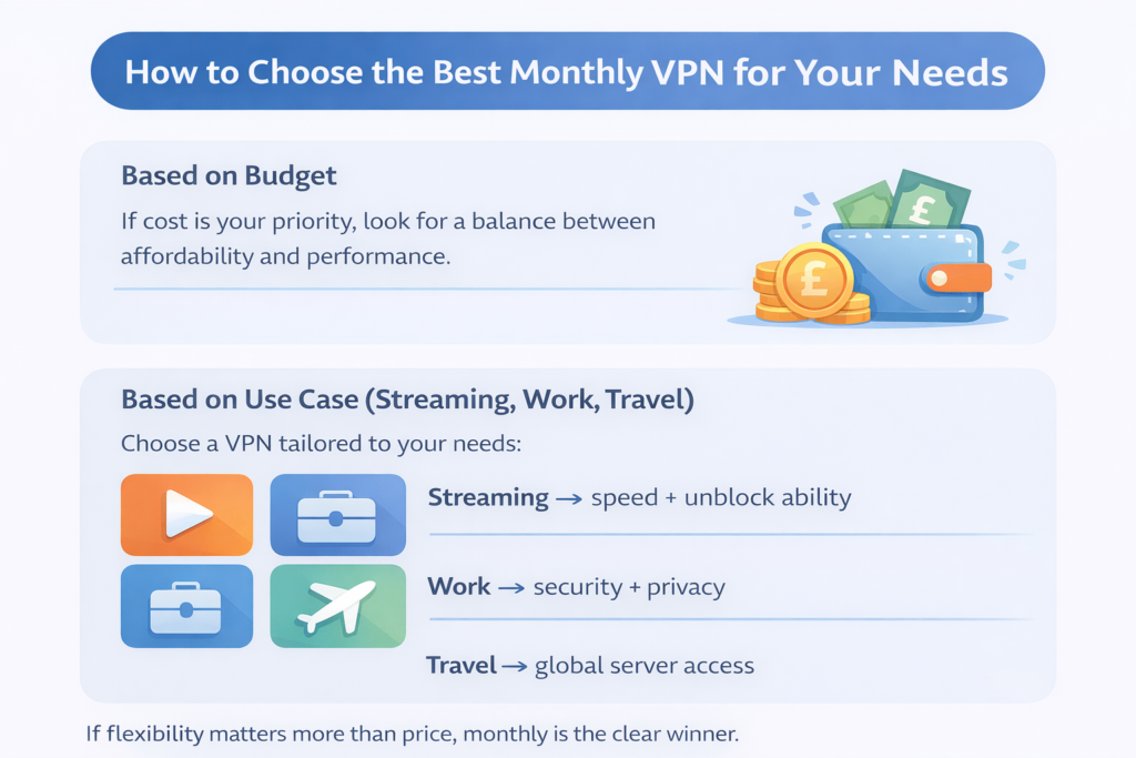 If your main goal is streaming, a monthly vpn for streaming is a smart choice. You can test whether the VPN works with Netflix, BBC iPlayer, or Hulu without committing for a year.