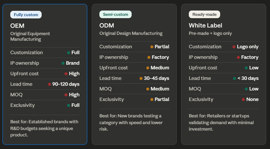 OEM, ODM, and white label aren’t a hierarchy — they’re a spectrum. The right entry point is the one that matches your brand’s current resources, risk tolerance, and competitive ambition. Start where you can execute well, and build toward the model that protects your product long-term.