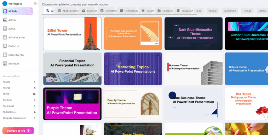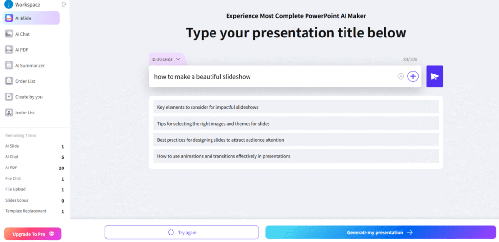 - Templates & Design: AI picks layouts, fonts, and colors that make the slides look professional.