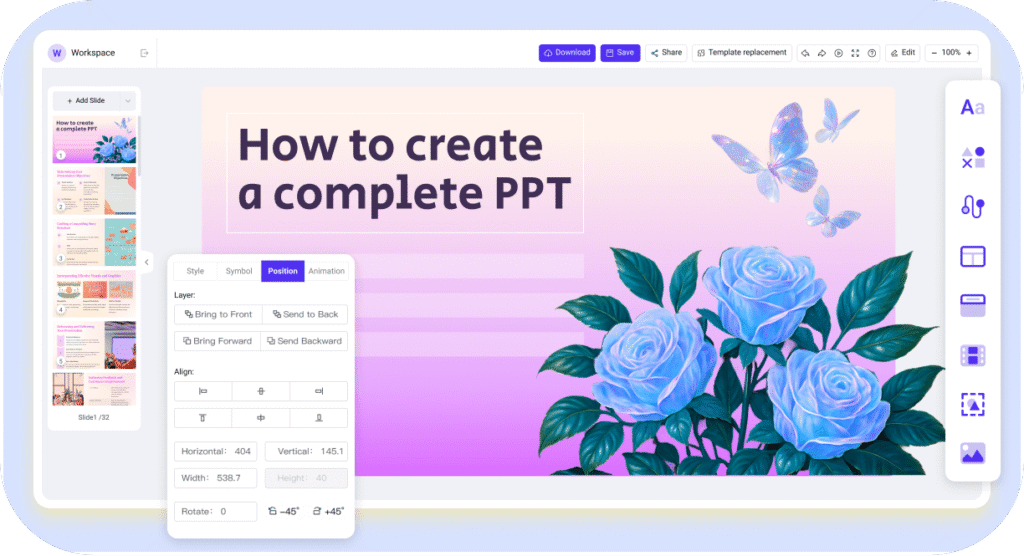 - AI Slide Maker: Just type a topic, and WorkPPT creates a full presentation with content, structure, and design.