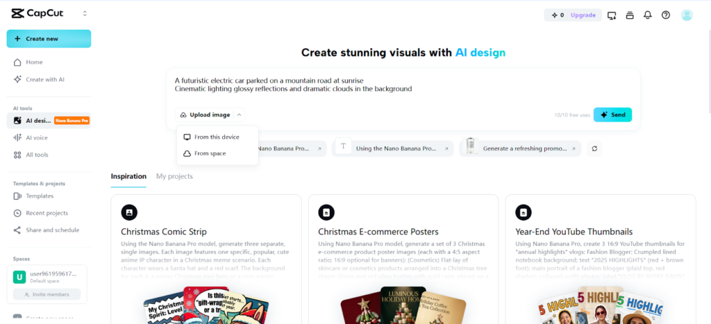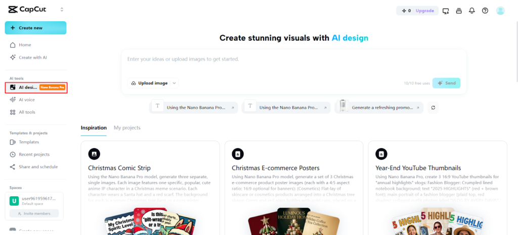 First, open CapCut and access the online AI photo editor. Sign up and enter the main interface. Choose the “AI design” tool from the left vertical menu. This tool supports scenery edits, poster layouts, and creative designs. It helps create high-quality visuals for work or social media quickly.