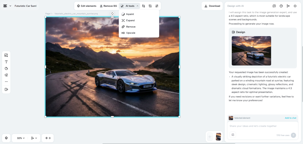 Adjust results using editing options. Change background color, add text or stickers if required. Apply AI tools like Inpaint, remove, or expand features for smooth edges.