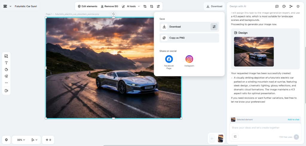 Click “Download”, select Format (JPEG, PNG, or PDF) and Size, or copy the image as PNG. Share directly to Facebook or Instagram anytime.