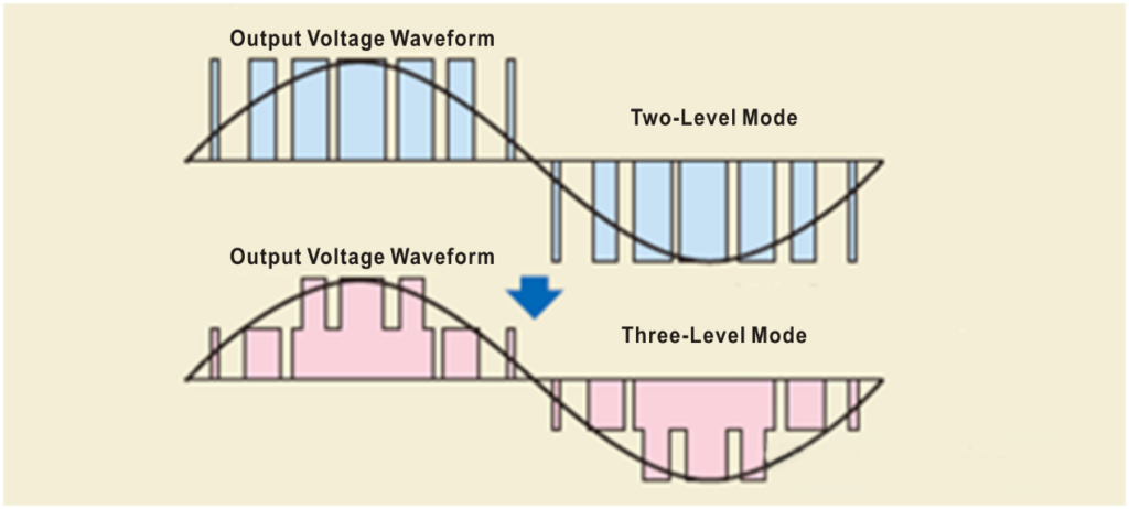 Traditional two-level inverters produce waveforms resembling steep staircases, with high harmonics and losses. Three-level inverter technology can output positive, zero, and negative voltage levels, resulting in a waveform closer to a smooth sine wave.