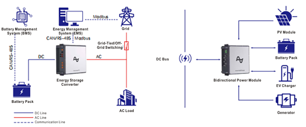 • DC → AC (Inversion/Discharging Mode): Releases energy from the batteries, feeding it back to the grid or loads.